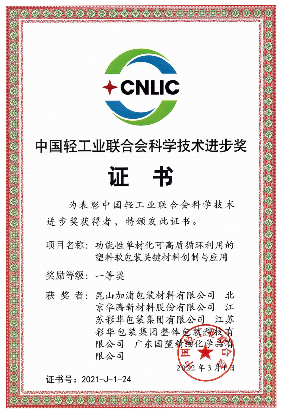2021年度中國輕工業(yè)聯(lián)合會(huì)授獎(jiǎng)項(xiàng)目共223項(xiàng)。其中,北京華騰新材料股份有限公司及其全資子公司廣東國望精細(xì)化學(xué)品有限公司與江蘇彩華包裝集團(tuán)聯(lián)合完成的科技項(xiàng)目“功能性單材化可高質(zhì)循環(huán)利用的塑料軟包裝關(guān)鍵材料創(chuàng)制與應(yīng)用”榮獲中國輕工業(yè)聯(lián)合會(huì)“科學(xué)技術(shù)進(jìn)步獎(jiǎng)一等獎(jiǎng)”。